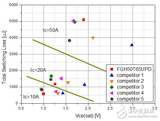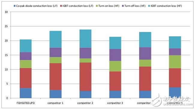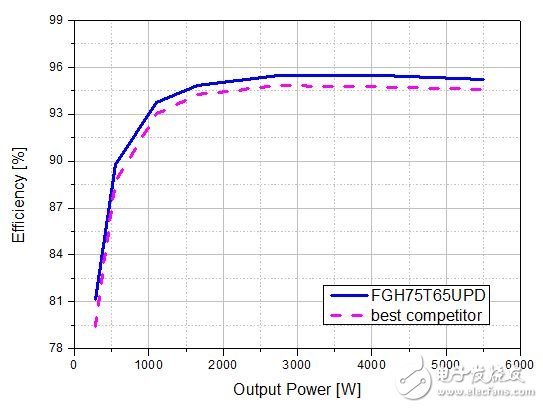 图3显示额定值为50A的新场截止沟道IGBT、FGH50T65UPD及其竞争产品的另一权衡取舍。FGH50T65UPD显示10A和20A的权衡取舍,这是多数应用中的实用工作电流水平。基于这些特性,估计系统中的功率损耗。目标系统是3kW额定混合频率全桥逆变器。两个低端IGBT在线路频率下切换,两个高端IGBT在17kHz切换。估计的功率损耗在图4中总结。要验证功率损耗估计值,使用两个IGBT评估系统效率;FGH50T65UPD和竞争产品3 IGBT(与FGH50T65UPD具有类似的功率损耗)。图5显示3kW逆变器系统的测量效率。竞争产品3 IGBT在全负载时接近FGH50T65UPD。这与估计值相匹配。此外,效率差距随着负载的减小而变大。这也与图3相符,图3中显示当电流水平较低时 FGH50T65UPD的性能优于竞争产品。