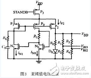 所以在模拟电路中起着非常重要的作用,同时也是影响电路功耗的一大因素。本文利用MOS 管的亚阈值特性,设计了工作在亚阈值区的电压基准电路, 能够满足上述功耗要求,电路结构如图3 所示。