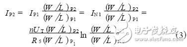 可以看出,不考虑电阻R1的温度系数,电流IN 1与热电压U T 成线性关系,具有正温度系数。P2 和P1组成电流镜,假定流过P2 的电流为IP2,则有: