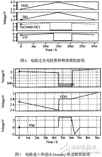 电路采用UMC 0. 6 μm数字电路SPICE 模型进行HSPICE 模拟验证。图4 给出了电路对电池电压VDD 进入和退出过充电状态时的模拟结果,从图中可看出,过充电出现后,CO端被置为低电平,反之则是与电源电压相等的高电平。