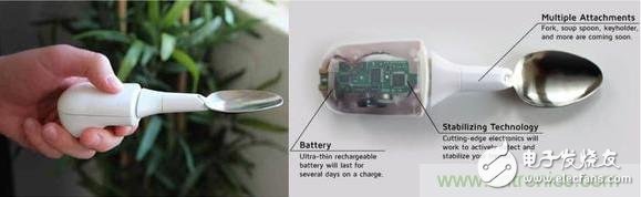 Liftware Spoon 内置了类似 iPhone 加速度计的感应装置、电源以及震动装置。也就是说,当勺子感受到拿着勺子的手开始抖动之后,内置的震动装置就会开始控制勺子向相反的方向开始运动,从而可以保证勺子本身处在同一水平面上,也就是说勺子不动了。