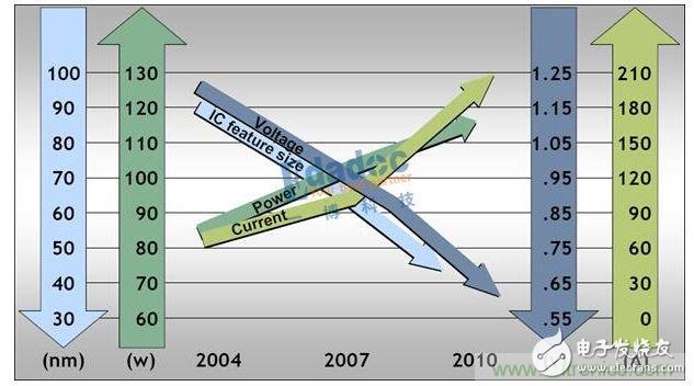 其实高压低压,并不是这两类问题的主要分界点。我真正想说的主要区别是,现在传统的功能电路,也就是我们设计的CPU,DSP,大规模的FPGA,Core电流经常就有几十安培,IO电源的电流也变得越来越大。电源设计的趋势如下图所示: