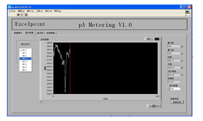 软件安装运行 pA Metering.exe 软件,请确保已经安装 pA Metering 驱动或者安装 Labview2014 运行引擎和 Labview visa 驱动(visa540_full.exe),和安装 MCP2200 USB 驱动。配置串口打开软件,选择对应的串口号,并选择如下设置:波特率:38400 数据位:8 校验位:None 停止位:1 最后点击"打开串口"按钮