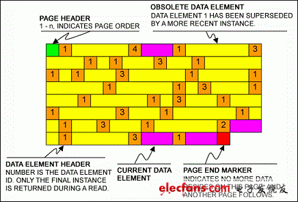 写数据单元时,写子程序必须知道要写的数据、数据单元的长度和数据要写的位置。很容易可以知道数据写在哪个地址;无论是新数据单元还是更新已有的数据单元,都会写在存储阵列的末尾。写命令会搜索阵列的末尾,紧接着在最后一个记录后写入新的数据单元。假如在当前的存储页面没有足够的空间保存特定长度的数据元,就会出现页面结束标志并打开一个新页面。图2是这种典型的数据页面的结构。