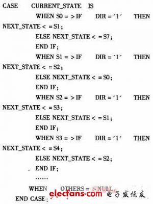 程序的结构体部分由3部分组成:说明部分,主控时序进程,主控组合进程。在说明部分中定义相关的信号及常数;在主控时序进程中负责把计算好的次态的信息送入初态,并负责最后的输出;在主控组合进程中负责相关的计算,比如判断启动和停止,正转和反转,以及在正反转状态下如何取下一个状态。下面这段程序就是结构体里主控组合进程中,如何判断电机正反转和下一步电机将如何动作的程序段。