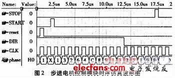 从图2中可以看到,在模拟步进电机启动、停止、正反转时电机的状态。比如在复位后当START=‘1’时,如果这时DIR=‘1’表示电机是正转,则电机的通电状态是A—AB—B—BC—C—CD—D—AD,对应的CPLD的输出状态就为S0~S7。当DIR=‘0’时表示电机是反转,就图2的截图来说在CLK的上升沿时,输出是状态S2,因为它的前一个状态从图上我们可以看出是S1。