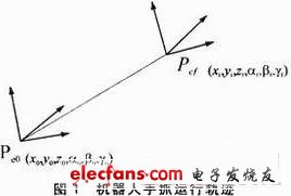 设机械臂初始和终止位姿分别记为:Xe0=[Pe0,ψe0],Xef=[Pef,ψef]。要求机械臂末端手爪沿Xe0到Xef的直线路径运动,起点和终点分别为Pe0(x0.y0,z0,α0,β0,γ0)和Pef(xf,yf,zf,αf,βf,γf),机器人手抓运行轨迹如图1所示。