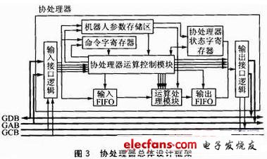 协处理器总体设计框架如图3所示。GDB、GAB、GCB分别表示外部的数据、地址和控制总线。协处理器主要包含输入/输出接口逻辑、机器人参数存储区、协处理器运算控制模块、运算处理模块、命令字寄存器、协处理器状态字寄存器和输入/输出FIFO构成。