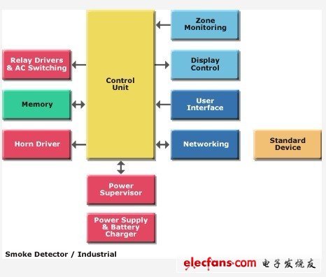 先进的烟火探测器通过电线互联在一起,通常配备了热传感器。当温度快速上升时,这种热传感器能够触发烟雾警报。 光电探测器的供电通常来自安防柜。 下列结构图建议的产品将帮助您实现高性能烟热报警系统。