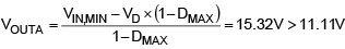 最小tOFF = 160ns对应的最大占空比为68%。当最大占空比受限制时(输入电压较低,这里为5V),根据boost占空比公式(式20),MAX15005在OUTA端能够提供的最大稳定电压是: