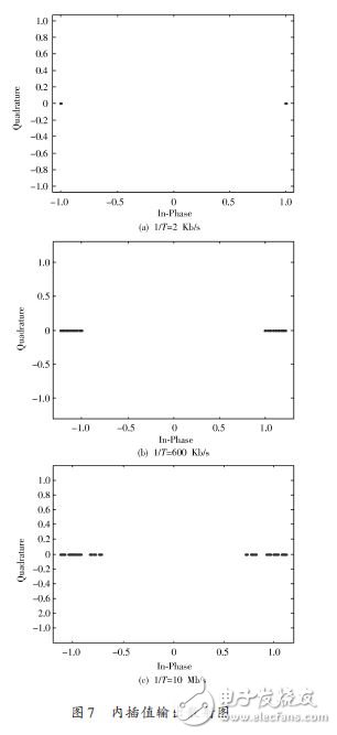 从图7可以看出,在基带速率和采样率满足奈奎斯特定理的条件下,该仿真输出的内插值均集中在理想值 -1和1周围,虽然有一定的模糊,且频率越高,模糊程度越大,但码元判决阈值在0值点,所以判决值无需严格为±1,该图表明对于较宽速率范围内的基带信号,输出的插值均能够较好地用于码元判决,即算法正确。