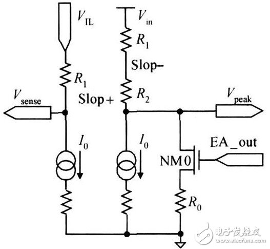 其中 INM0为流过NM0 的电流,随误差放大器输出的变化而变化。 V sense 和V peak 是输入到后级电流比较器的信号。