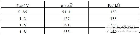 测试中应用的Buck 变换器拓扑如图8 示。 设置工作频率为1MHz , 输入电压范围2 ~ 7V , 输出电压115V. 改变分压电阻的取值可改变输出电压,表1 为一组典型应用下的分压电阻取值参考。 电路可承受的负载范围为0~500mA ,足以能满足一般便携式设备的应用需求。