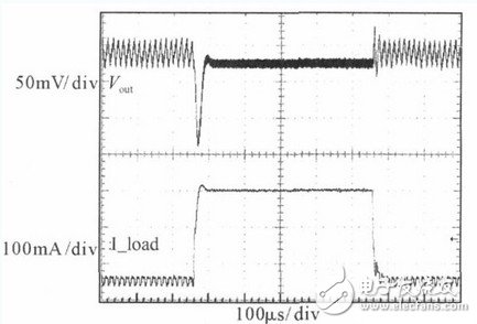 图12 所示是负载跳变时输出响应的测试结果。 测试中使负载在50 和300mA 之间跳变,负载变化速率为800mA/μs. 波形显示,Burst 工作模式下的输出电压平均值比PWM 模式下的高20mV ,这是由于在两种模式下采用了不同基准。 在重载跳变到轻载的过程中,过冲电压为32mV ,恢复时间为2μs ,较好地实现了对于过冲电压的抑制,且在两个周期内就可以完成模式转换达到稳定状态,响应速度相当快。