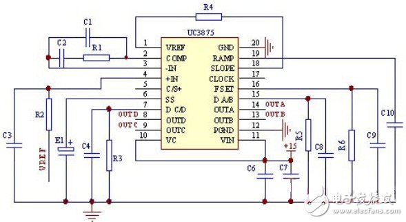 控制电路的原理图主要部分如图3所示。 UC3875的核心是相位调制器, 其13脚B输出信号与14脚A输出信号反相, 9脚C输出信号与8脚D输出信号反相, 这四个驱动信号经扩流后由驱动变压器去驱动 ~ MOS管。相位控制的特点体现在UC3875的四个输出端具有相同的驱动脉冲分别驱动A/B、C/D两个半桥,通过移相错位控制有源时间,使全桥的四个开关轮流导通。每个输出级导通前都有一个死区,而且可以调整死区时间。在该死区时间内确保下一个功率开关器件的输出电容放电完毕,为即将导通的开关器件提供电压开通条件。因此,每对输出级(A/B,C/D)的谐振开关作用时间,可以单独控制。在全桥变换拓扑模式下,移相控制的优点得到最充分的体现。 UC3875在电压模式和电流模式下均可工作,并具有过电流关断以实现故障的快速保护。