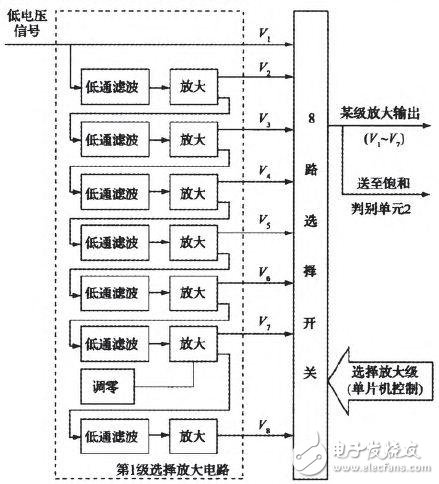 压信号在第l级进行放大时,由中央处理器控制放大级数。级数的确定先由多路开关依次闭合,由状态判别电路做出判断,当输出信号首次超过运放工作的线性范围时,级数倒退1级,并送往中央处理器。为避免工频干扰信号数次被放大,每级放大电路都设置低通滤波器。调零电路设置在放大电路的末级,以避免测量电路本身失调信号被数次放大后,可能超出其工作的线性范围。