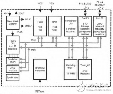 由于辅助CPU是长期工作,永不断电的,选则的基本原则就是超低功耗,架构简单,极高的可靠性。本文选择的是TI的MSP430F2001,MSP430单片机拥有0.5uA的超低待机电流和250uA/MIPs的运行功耗,是目前业界公认的低功耗单片机。其提供了5种低功耗模式,主要面向电池供电的应用。功能框图如图4所示: