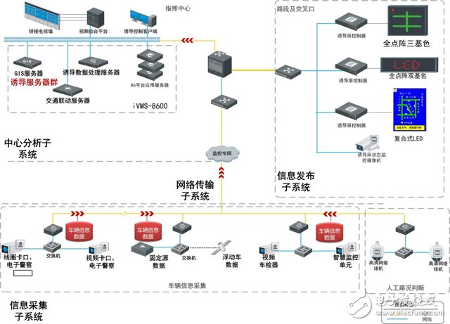 交通诱导系统由四个子系统构成,即信息采集子系统,网络传输子系统、中心分析子系统和信息发布子系统。前端采集的车辆信息经过中心分析计算后得出路况交通状态,也可以通过视频监控人工判断路况交通状态,并在外场交通诱导屏予以公布,实现道路路况交通状态的实时通报。