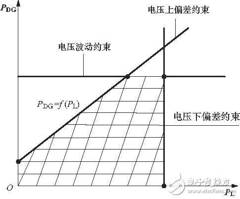 在不对分布式电源采取任何控制措施的条件下,分布式电源可接入容量必须同时满足3个约束条件(即分布式电源接入配电网引起的最大电压上偏差值与最大电压波动值不越限,以及无分布式电源接入配电网时单纯由负载引起的最大电压下偏差值不越限),这3条曲线共同围成的阴影部分区域就是不对分布式电源采取任何控制措施的条件下分布式电源的可接入容量范围[11],见图2。图中,PDG和PL分别表示分布式电源的容量和负荷功率。