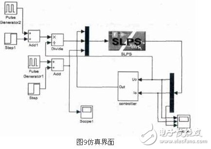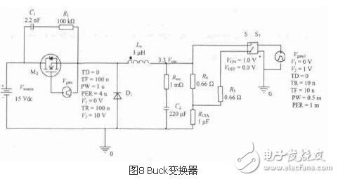 的和Matlab进行联合仿真的接口,即Matlab /Simulink中的SLPS模块。所以本控制系统中Buck变换的设计和仿真在Pspice环境下进行。仿真以14~22 V直流输入3.3 V/(0~10 A)直流输出为Buck变换器输入输出指标,其中Lo=30μH,Co=220μF,如图8,图9所示。
