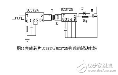 和6脚两端产生高频调制波,经高频小磁环变压器隔离后送到UC3725芯片7、8两脚经UC3725进行调制后得到驱动信号,UC3725内部有一肖特基整流桥同时将7、8脚的高频调制波整流成一直流电压供驱动所需功率。一般来说载波频率越高驱动延时越小,但太高抗干扰变差;隔离变压器磁化电感越大磁化电流越小,UC3724发热越少,但太大使匝数增多导致寄生参数影响变大,同样会使抗干扰能力降低。根据实验数据得出:对于开关频率小于100kHz的信号一般取(400~500)kHz载波频率较好,变压器选用较高磁导如5K、7K等高频环形磁芯,其原边磁化电感小于约1毫亨左右为好。这种驱动电路仅适合于信号频率小于100kHz的场合,因信号频率相对载波频率太高的话,相对延时太多,且所需驱动功率增大,UC3724和UC3725芯片发热温升较高,故100kHz以上开关频率仅对较小极电容的MOSFET才可以。对于1kVA左右开关频率小于100kHz的场合,它是一种良好的驱动电路。该电路具有以下特点:单电源工作,控制信号与驱动实现隔离,结构简单尺寸较小,尤其适用于占空比变化不确定或信号频率也变化的场合。