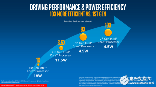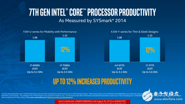 桌面版的处理器性能足够强劲,当然对于不少应用或者是功耗受限的移动平台,能效比的提升还是至关重要的。Intel官方的PDF数据显示,两款新的Core i7处理器相比上代产品在浏览器性能和SYSMark上分别提供超过18%和12%,其中Core i7-7500U相比上代产品浏览器性能提升为19%。