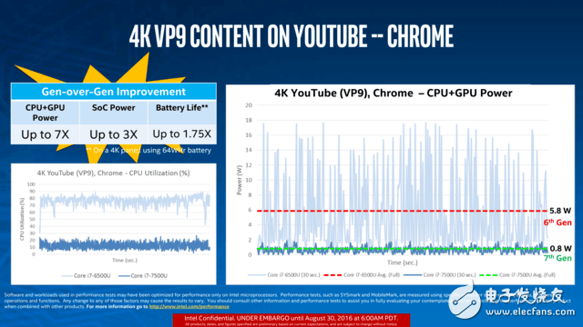 性能方面,Intel官方公布的本地4K HEVC 10bit视频播放和Youtube 4K VP9内容播放,Core i7-7500U处理器功耗相比Core i7-6500U大幅下降,分别只有0.5W和0.8W,而Core i7-6500U分别为10.2W和5.8W,分别只有1/20和1/7,对于高清玩家无疑是个不错的选择。