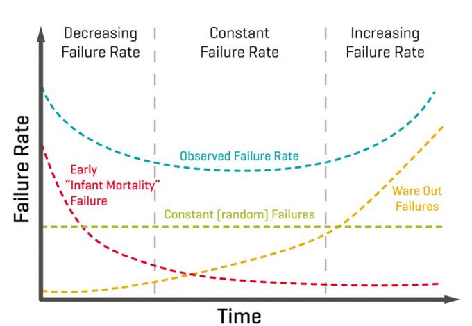 图2:PSU的寿命有三个阶段:"早期故障率"在第一阶段很高,持续时间约24小时。装运前预烧可避免这些"早期故障率"故障