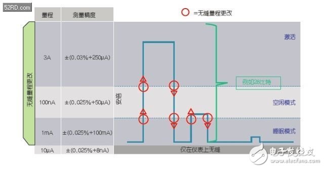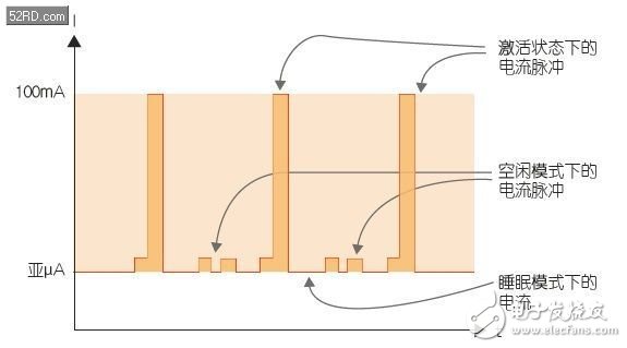 不同的工作模式会导致电流消耗跨越从亚uA 到100mA 很宽的动态范围,其比值达到了1:1,000,000。