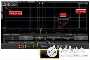 通过平移和缩放功能,我们能够看到电流电平和每个功率电平的保持时间。使用传统测量工具无法看到的细节现在能够一览无遗并进行测量。图4中使用 "???"确定的后沿脉冲便是一个明显示例。软件揭开了这个令人意外的秘密:对于3.3μA的平均电流,器件在大约90μA峰值处消耗脉冲能量,持续时间为500ms。将这个电流消耗与599nA 睡眠电流相加,结果达到了730nA,这比我们预期的电流高22%。这种意外可能是造成我们低估能量要求,使电池供电时间短于预期的原因之一。