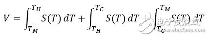 式中,∇V为电压梯度,∇T为温度梯度,S(T)为塞贝克系数。塞贝克系数与材料相关,并且也是温度的函数。一段金属丝上两个不同温度点之间的电压等于塞贝克系数函数在温度上的积分。