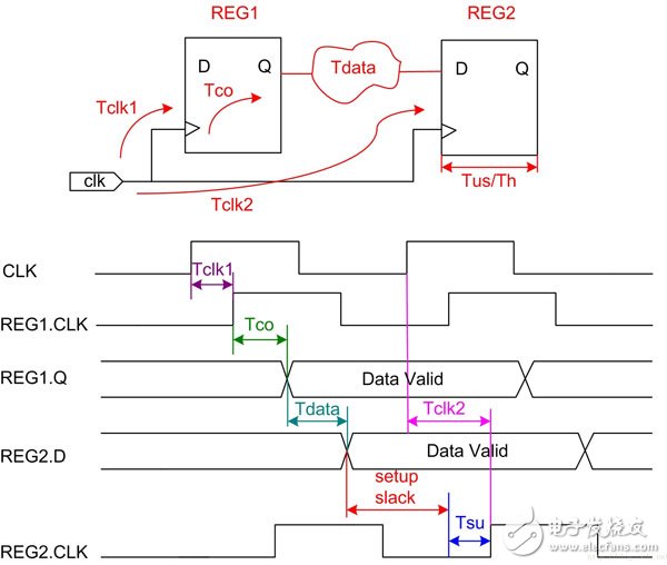 输入数据在有效时钟沿后到达所需要的时间。主要分为三部分:时钟到达寄存器时间(Tclk1),寄存器输出延时(Tco)和数据传输延时(Tdata)