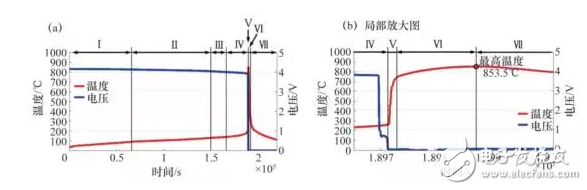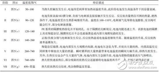 图4、图5与表2展示了某款具有三元正极/PE基质的陶瓷隔膜/石墨负极的25 A·h锂离子动力电池的热失控机理。热失控过程分为了7个阶段。