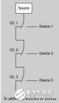 层叠开关架构是多位置开关的一种替代形式。它采用多个继电器将一个输入连接到多个输出。路径长度(同时决定了相位延迟)是由信号经过的继电器的数量决定的。