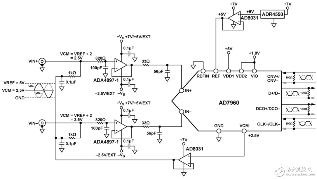 AD7960差分输入范围由5 V或4.096 V外部基准电压源设置。图1中,5 V基准电压源由 ADR4550提供,该基准电压源具有高精度、低功耗(950μA最大工作电流)、低噪声特性,最大初始误差为±0.02%,提供出色的温度稳定性和低输出噪声性能。 AD8031用于缓冲外部基准电压源和AD7960的共模输出电压,适合各种应用,从高带宽电池供电系统到元器件密度要求具有更低功耗的高速系统。AD8031具有大容性负载稳定性,可驱动去耦电容,用于最大程度降低瞬态电流引起的电压尖峰。