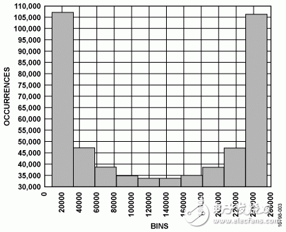图3中的直方图以及图4中的FFT曲线显示该电路的精密性能,采用5 V外部基准电压源。使用 EVAL-AD7960FMCZ评估板获取数据,使用Audio Precision SYS-2702作为信号源。