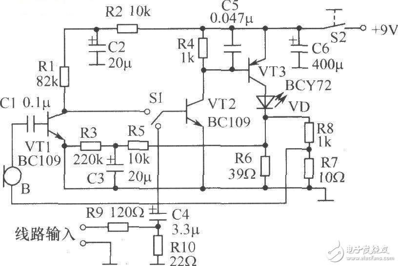 这是一个三级直接耦合放大电路,VT1、VT2为两级音频信号电压放大器,VT3为音频功率放大器,激光发射二极管VD串接在VT3的集电极电路中,它的工作状态始终与功率管VT3的工作状态保持一致。音频信号设有两种输入方式:一种是话筒B将声音转换成电信号,经C1耦合送人VT1的基极;另一种是将 "随身听"或其他音源引出的音频信号接在线路输入端,由R9、R10分压后,经C4耦合到VT2的基极。图中,C2、R2、C6组成电源退耦电路,防止出现低频自激。