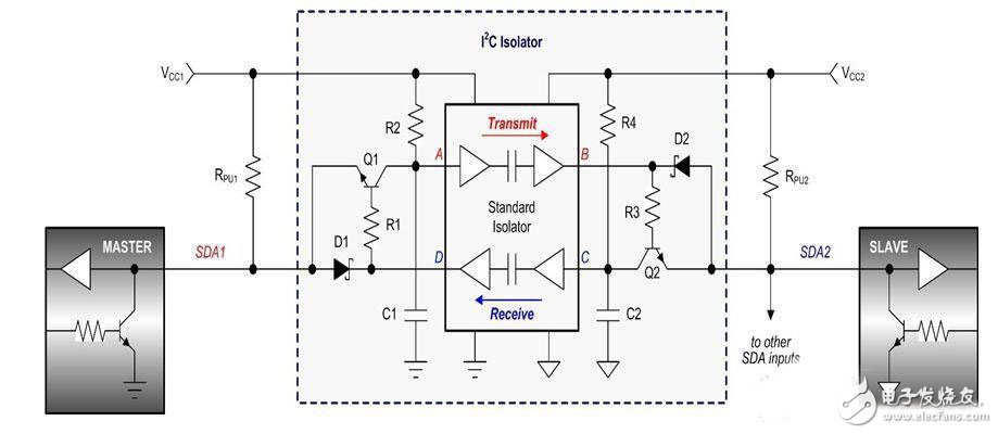 在待机模式下,隔离器输入 A 和 C 通过 R2 和 R4 被拉至高电平,推高输出 B 和 D。另外,主和从数据线路(SDA1 和 SDA2)通过 RPU1 和 RPU2 被拉至高电平。当主机通过拉低 SDA1 开始通信时,Q1 发射极结点被正向偏置,而 Q1 将输入 A 拉至低电平。输出B 跟着变为低电平,并正向偏置 D2。D2 拉低 SDA2。与此同时,Q2 发射极结点被反向偏置,并且 Q2 保持高阻抗。开关顺序相同,仅在从数据线路响应时反向。