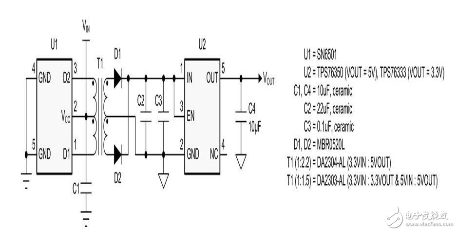 图 6 显示了最终的电路情况。至少使用 0.1Μf 电容器来对芯片电源进行缓冲。通过 1k 到 10k电阻器,始终将激活输入端连接至各个电源轨。这些电阻器可控制进入电源线路的浪涌瞬态所引起的芯片突入电流。利用滤波器电容(此处为 220pF)来抑制敏感的 CMOS 输入噪声,是一种较好的模拟设计方法。没有隔离电源,隔离设计便不完整。图 7 显示了一种低成本、隔离式 DC/DC 转换器设计,用于替代昂贵的集成 DC/DC 模块。主副电源均可以在 3.3V 和 5V 之间变化。下列表格列出了三种电源组合的相应组件。