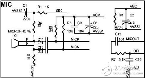 麦克风电路如图所示。凌阳的SPCE061A是16位单片机,具有DSP功能,有很强的信息处理能力,最高时钟可达到49M,具备运算速度高的优势等等,这为语音的播放、录放、合成及辨识提供了条件。本系统接入MIC电路如下图所示,MIC为录制语音辨识命令服务。麦克录音输入及AGC电路。