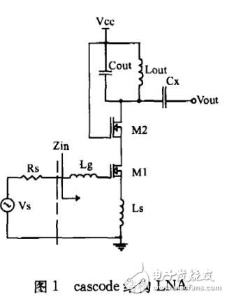 InducTIve-degenerate cascode结构是射频LNA设计中使用比较多的结构之一,因为这种结构能够增加LNA的增益,降低噪声系数,同时增加输入级和输出级之间的隔离度,提高稳定性。InducTIve-degenerate cascode结构在输入级MOS管的栅极和源极分别引入两个电感Lg和Ls,通过选择适当的电感值,使得输入回路在电路的工作频率附近产生谐振,从而抵消掉输入阻抗的虚部。由分析可知应用InducTIve-degenerate cascode结构输入阻抗得到一个50Ω的实部,但是这个实部并不是真正的电阻,因而不会产生噪声,所以很适合作为射频LNA的输入极。