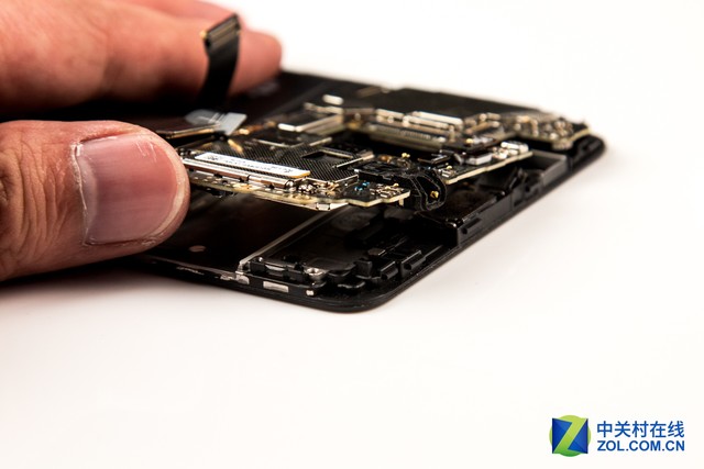 拆掉前后摄像头之后,接下来皆可以拆下主板,拆掉主板前还有最后一个障碍,就是主板右下角的同轴线,同轴线拆下,主板可以轻松拿下来了。