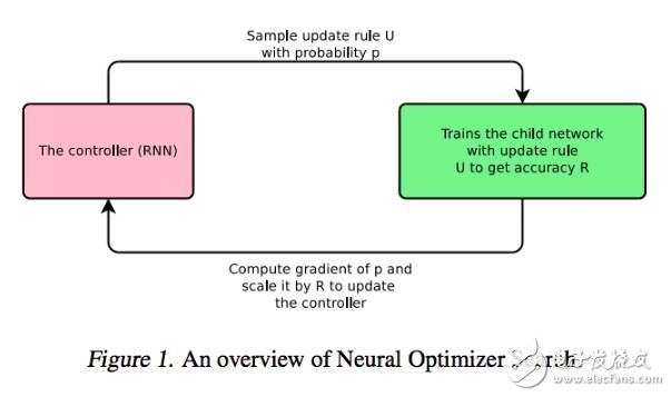 而 Google Brain 在 ICML 2017 的论文《Neural Optimizer Search with Reinforcement Learning》中,就讲到了一种学习优化更新规则的技术。神经优化器搜索如下图所示:
