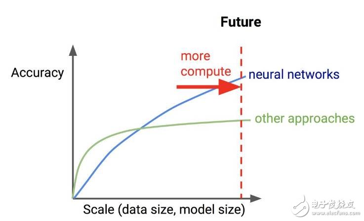 如今,神经网络与其他方法随数据、模型大小变化的准确率对比图如下: