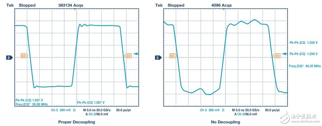 示波器图说明,没有去耦时,输出表现出不良响铃振荡,这主要是因为电源电压随负载电流变化而偏移。