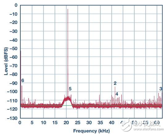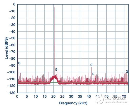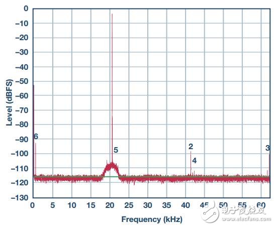 图6显示了从模拟电源去除去耦电容后的频谱。请注意,高频杂散信号增加了,还出现了一些交调产物(低频成分)。信号SNR已显著降低。本图与上图的唯一差异是去除了去耦电容。
