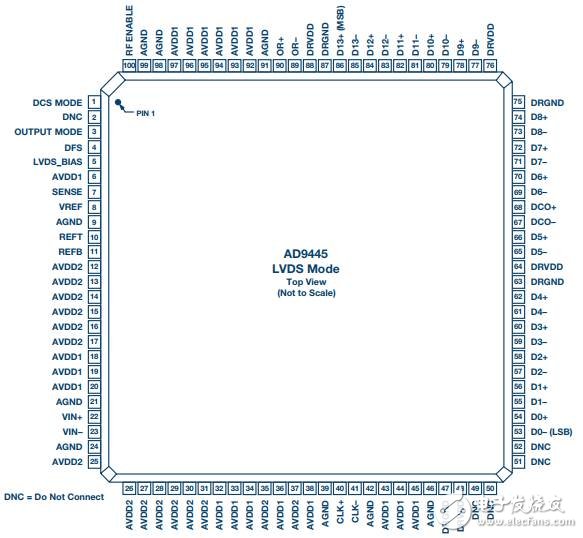 AD9445的引脚排列如图5所示。请注意,电源和接地引脚有多个。这是为了降低电源阻抗(并联引脚)。