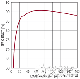 图 9:提供 140W 功率的 4 个 µModule稳压器的效率
