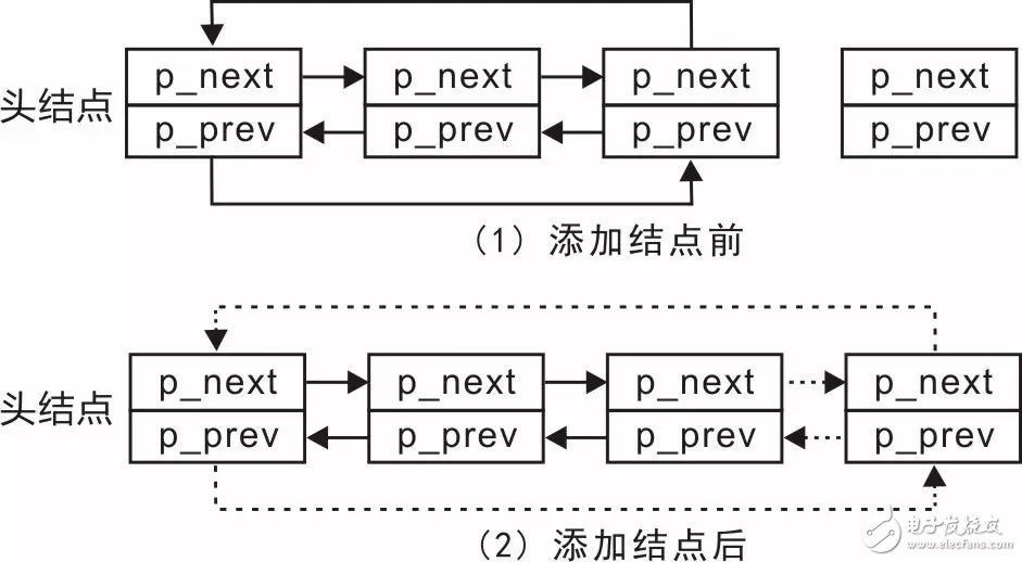 此时,头结点即为新添加结点的前结点,直接调用dlist_add()即可实现,其实现范例详见程序清单3.43。