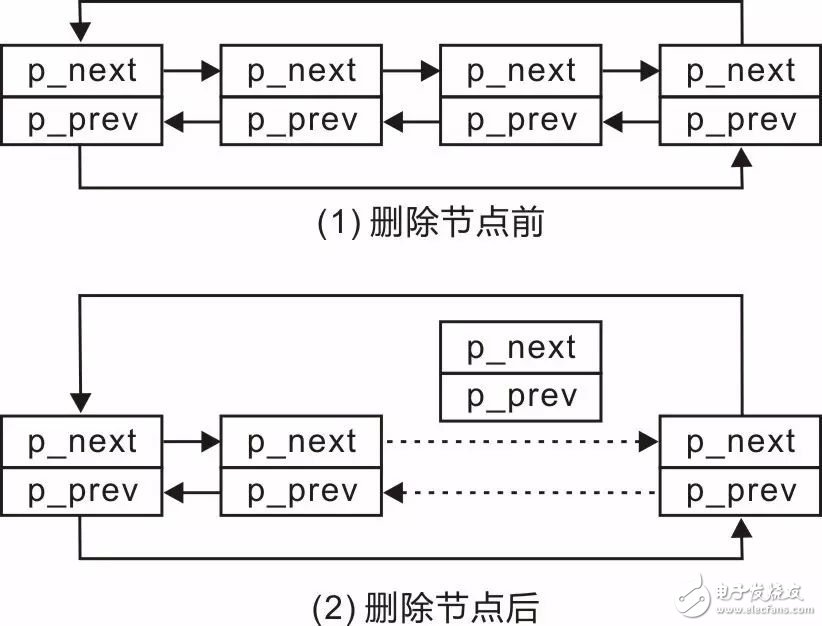 为了实现dlisd_del()函数,可以先查看删除任意结点的示意图,图 3.20(1)为删除节点前的示意图,图 3.20(2)为删除节点后的示意图。